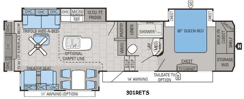 On the outside find exterior storage, a 14' awning covering the entry door, plus an optional 11' awning can be added outside of the dinette and theater seat slide if you choose. You can also add a Tailgate TV, a Ledgestone fireplace option in place of the standard model, or recliners in place of the theater seat, plus so much more!