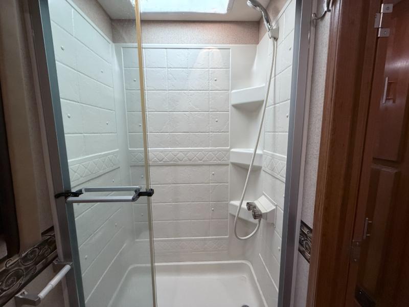 - Side-aisle bathroom with shower, toilet, and sink