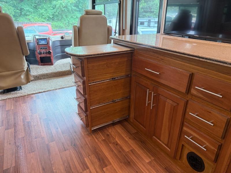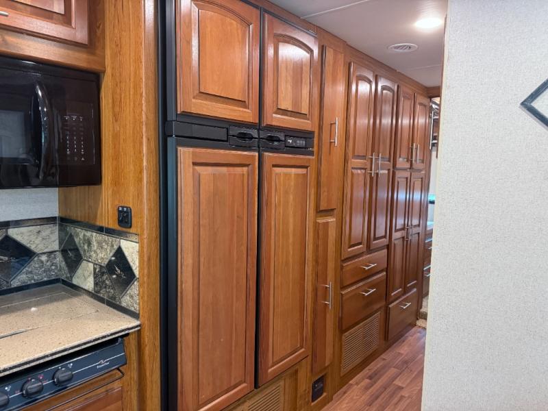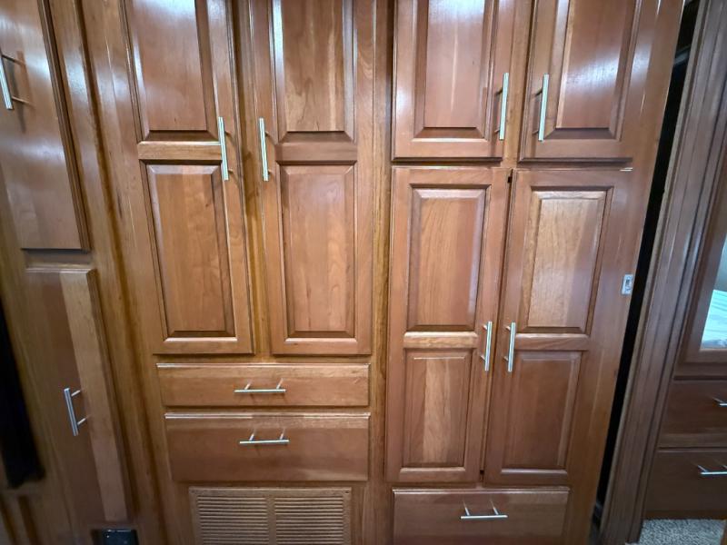 - Rear king bed slide-out with overhead cabinets