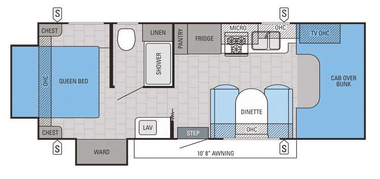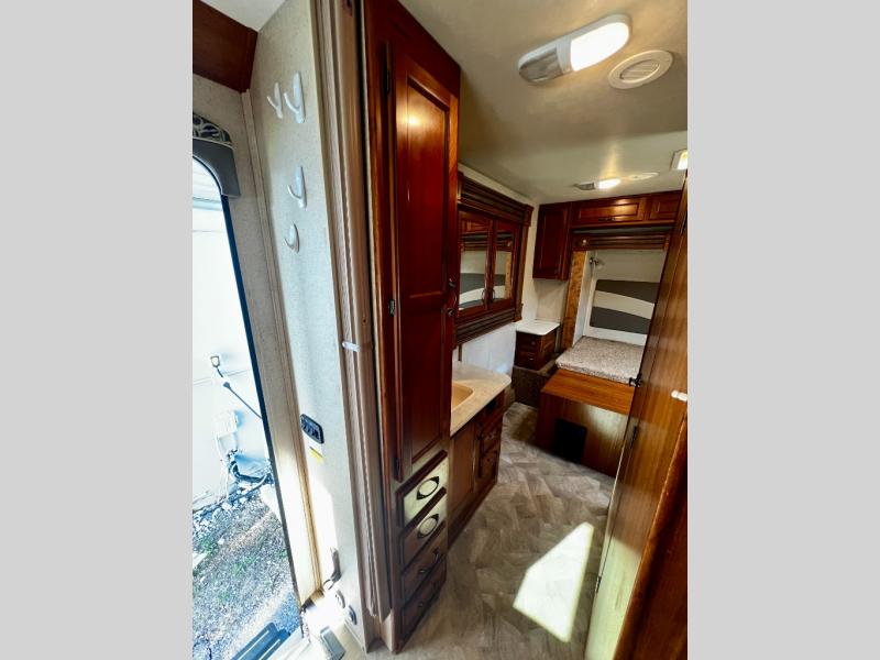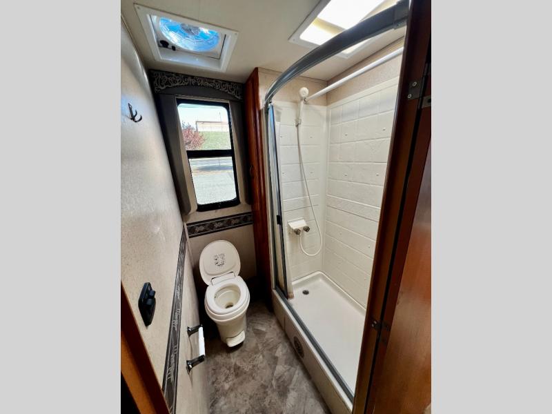 There are plenty of overhead cabinets throughout the motor home plus exterior storage. Outside of the motor home, you will enjoy relaxing under the 10'8" awning which provides shade from the sun, and more!