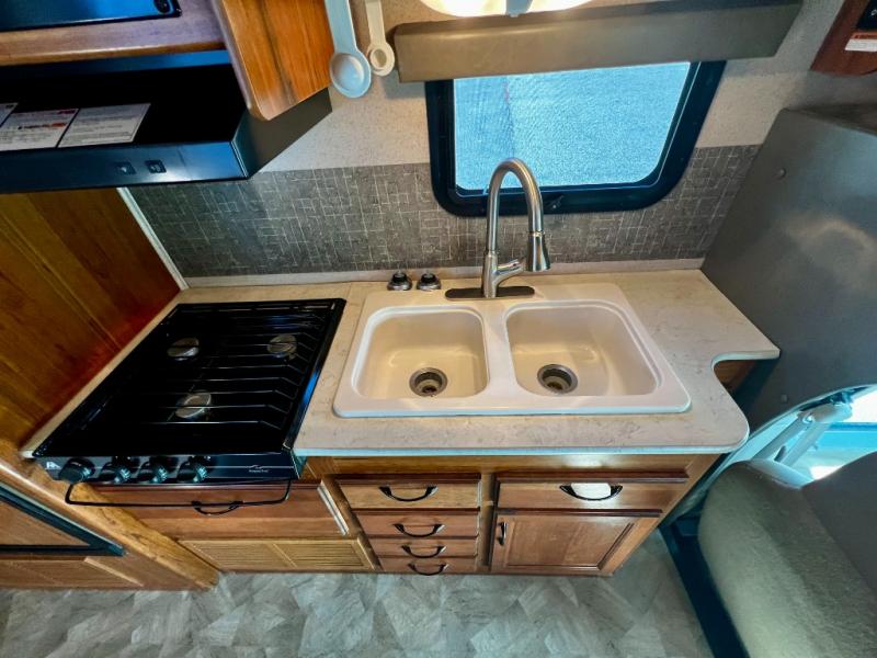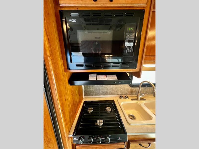 As you enter the motor home, to the right there is a dinette with an overhead cabinet above the dinette. The opposite side has a pantry, refrigerator, three burner range, microwave, and double kitchen sink.
