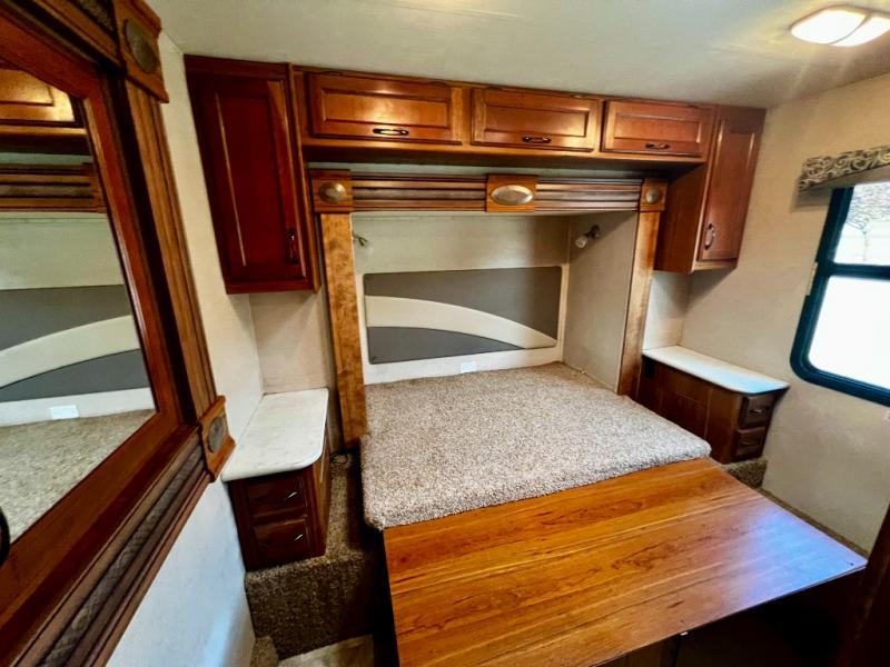 The rear bedroom has a slide with a queen bed, chests on either side of the bed, and a wardrobe slide.