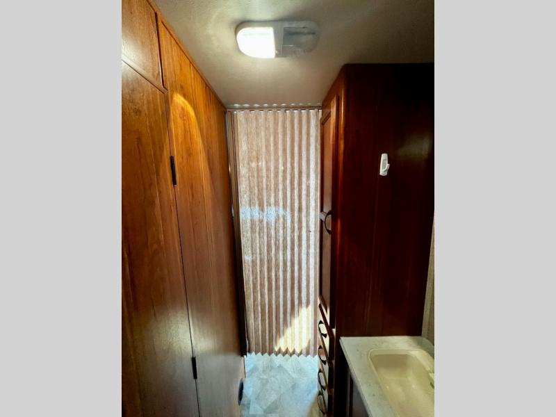 Toward the rear of the motor home is the bathroom. There is a shower, linen cabinet which can hold towels or toiletries, and a toilet. Outside of the bathroom, across the hall there is a sink.