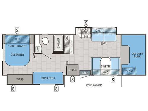 A set of bunk beds, double slides, and a front cab bunk are some of the features that you will love about the 31XL Redhawk class C motor home by Jayco.