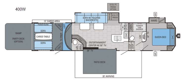 Enter the main living area and find a slide which helps to open up this space. The slide has a sofa with folding backrests, pantry, and 8 cu. ft. refrigerator, or you can choose an optional 12 cu. ft. refrigerator. Adjacent to the slide you will find a three burner range, microwave, overhead cabinet, and L-shaped counter with a double kitchen sink. To the left of the main entry door there is a patio deck which allows you to enjoy the outdoors, but yet be up off the ground. In the corner of the living area you will find an entertainment center with a 50" TV.