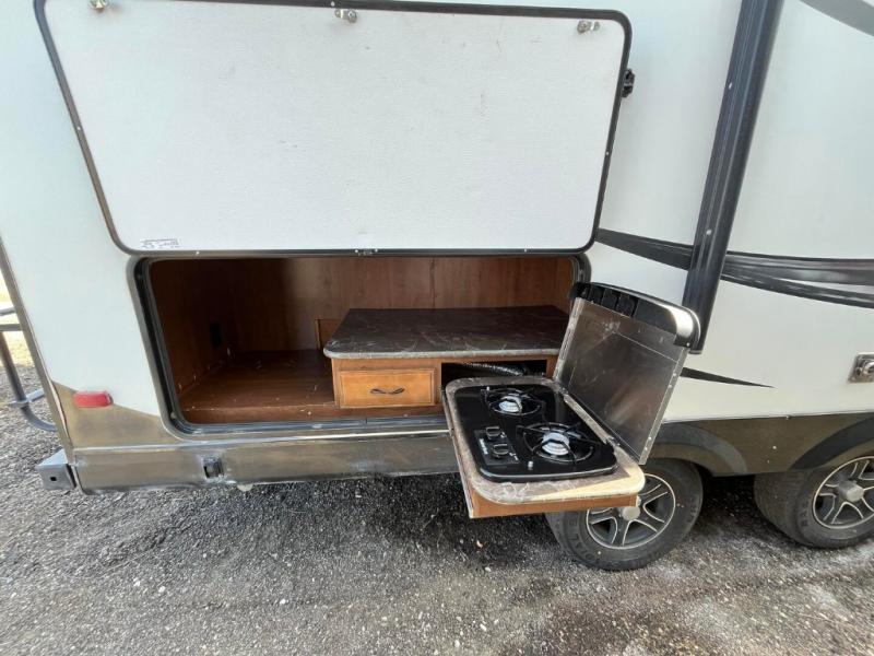 The outside kitchen features a pull-out two burner cook-top, a refrigerator, and counter space. You will also find a 13' awning to help create an outdoor living space just outside the door, plus so much more!