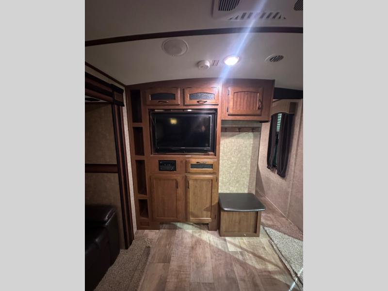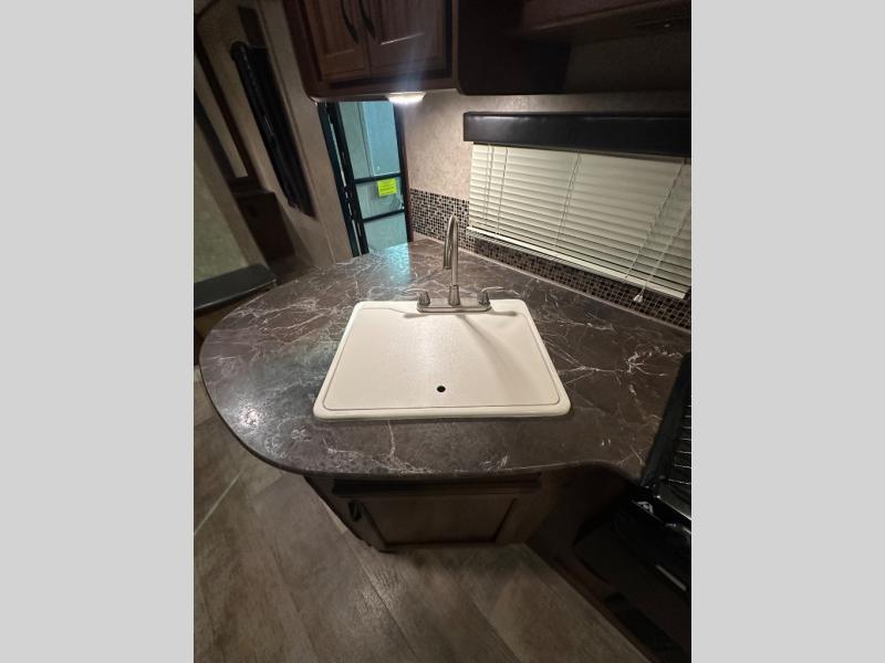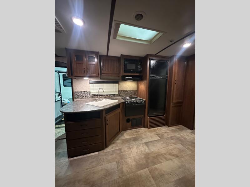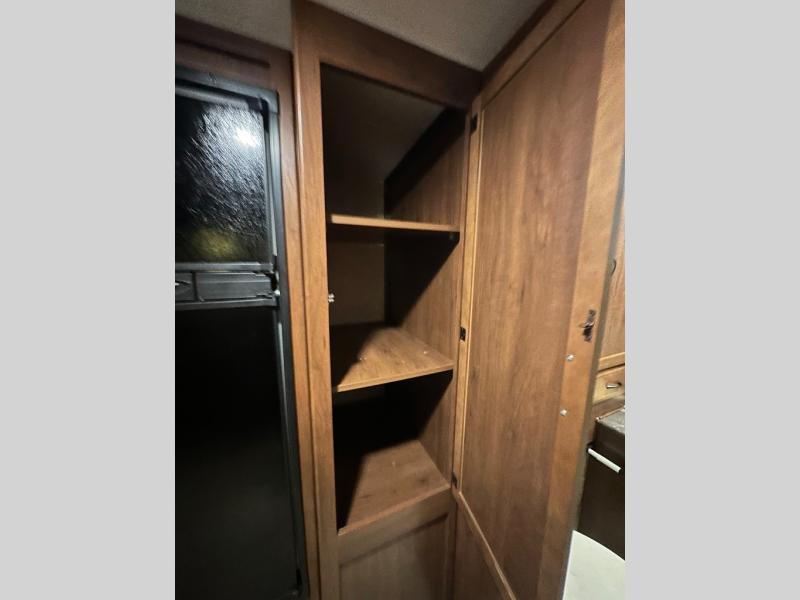 There are plenty of overhead cabinets throughout the trailer as well as outside storage. You are also sure to enjoy the outdoor kitchen which has a refrigerator, counter space, and a pull-out two burner cook-top.