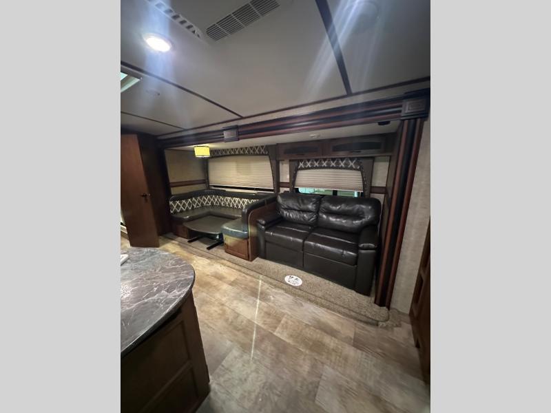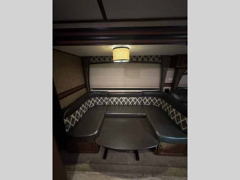 As you step inside the travel trailer, to the left is a angled kitchen sink and countertop, three burner range, microwave, refrigerator, and pantry. The opposite side of the travel trailer offers a u-shape dinette and a hide-a-bed sofa slide. Along the front wall there is an entertainment center and a bench seat with storage.