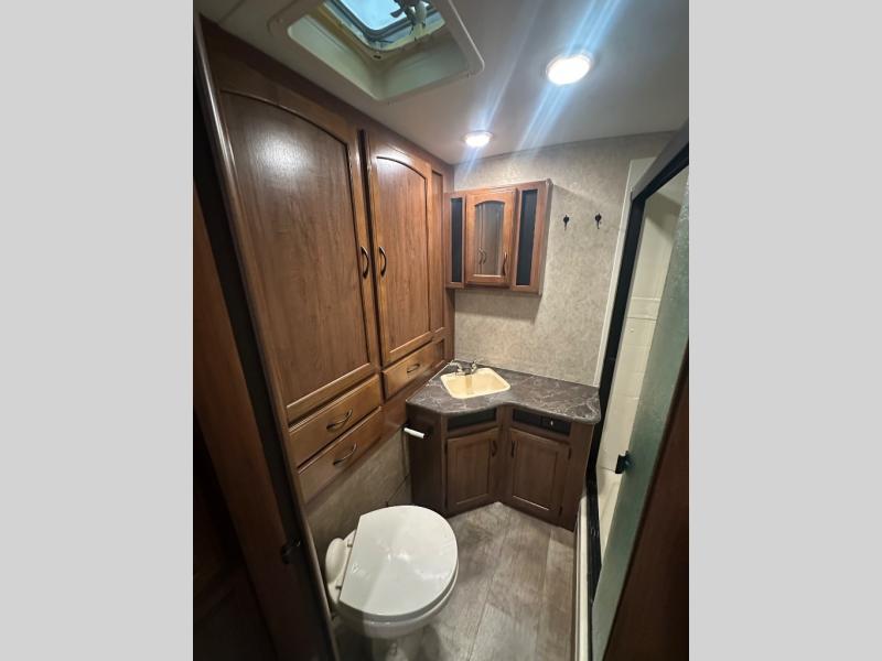 In the rear of the travel trailer, you will find the bathroom. There is a shower, wardrobe, sink, medicine cabinet, and a toilet.