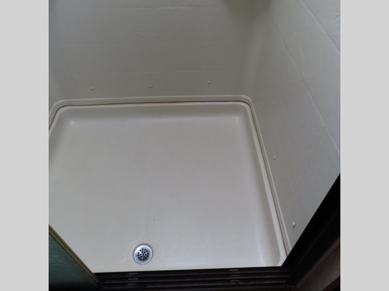 Located in the rear of the trailer you will find the bathroom. Inside the bathroom there is a toilet, shower, sink, medicine cabinet, and private entrance door which leads outside.