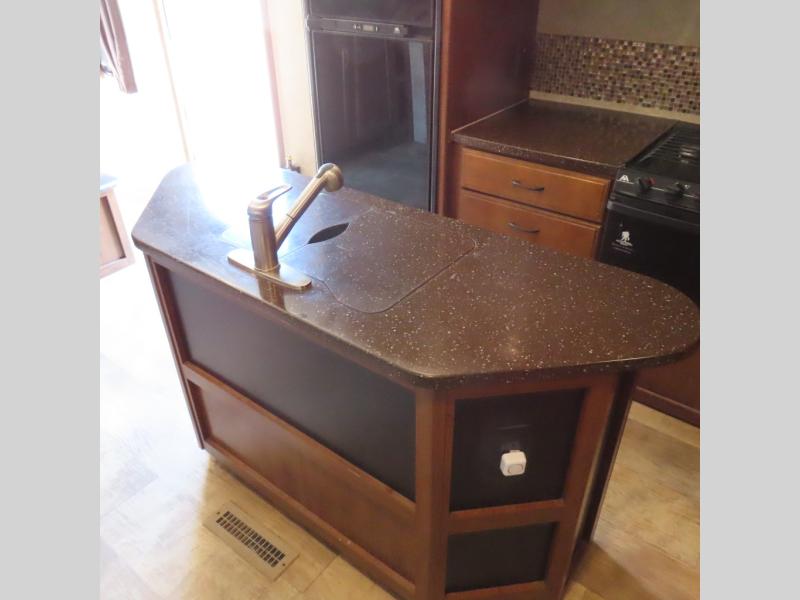 On the opposite side, the kitchen area has a refrigerator, three burner range, and microwave slide. Next to the slide there is a large pantry for your dry goods, and a linen cabinet for towels or toiletries. In the middle of the kitchen you will find an island with a kitchen sink and extra counter space for food prep.
