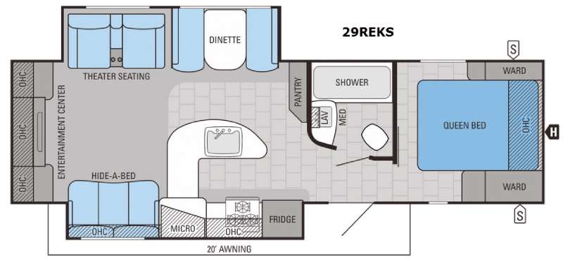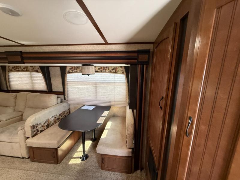 In the kitchen and living areas you will find a slide with a refrigerator, three burner range, microwave, kitchen peninsula, sink, and a hide-a-bed sofa. The opposing side of the travel trailer has a slide out with a booth dinette and theater seating. A pantry is on the interior wall for your non-perishables. Along the rear wall you will find an entertainment center with overhead cabinets which you are sure to enjoy from anywhere in the living and kitchen area.