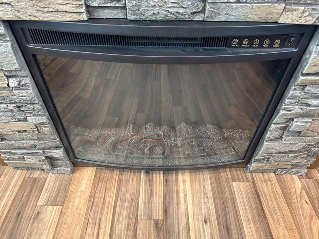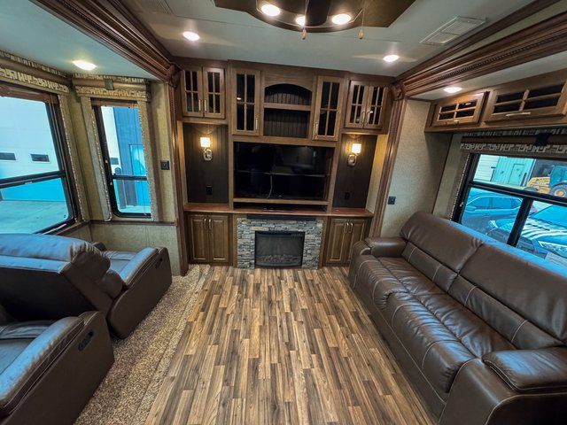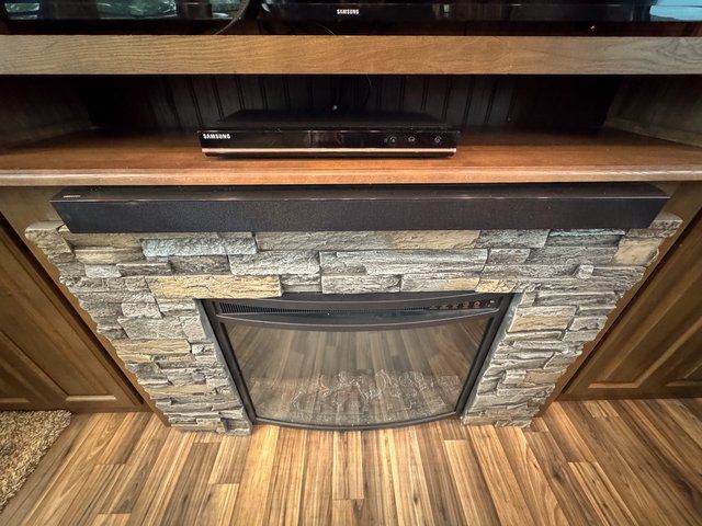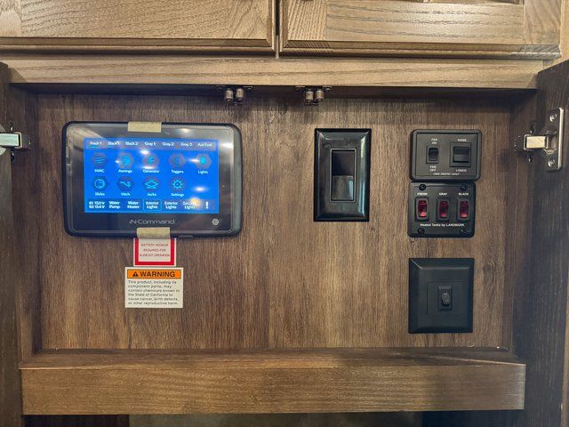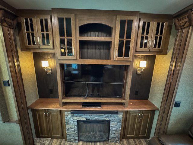 The rear wall features a full entertainment center with a fireplace, overhead cabinets and base cabinet storage. Not to mention the huge LED TV!