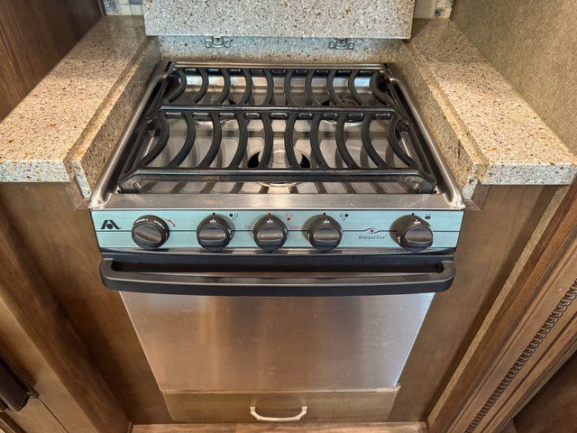 On the opposite side you will find a tri-fold sofa sleeper, 12 cu. ft. refrigerator, and three burner range slide out. There is also a corner counter area off to the side with curio cabinets above. Next to the curio you'll find a closet where you can easily store jackets. The kitchen island is where the double kitchen sink is located, and it provides a bit more counter space on either side.