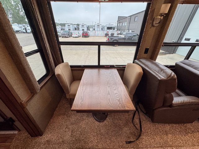 Step inside and see how open the combined kitchen and living area is with dual opposing slides. There is a free standing dinette with four chairs and a space for two additional lounge chairs in a slide to the left of the entry door.