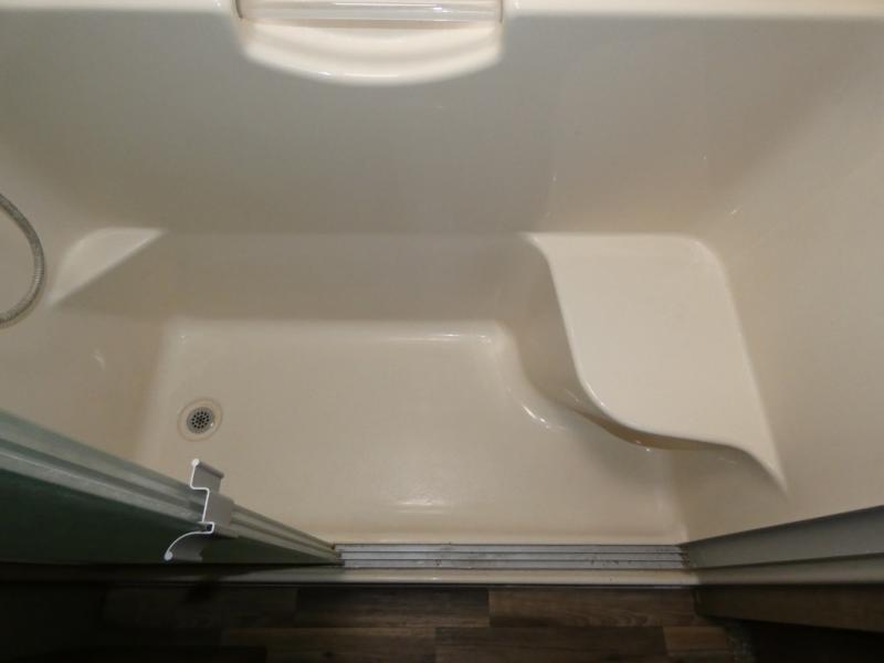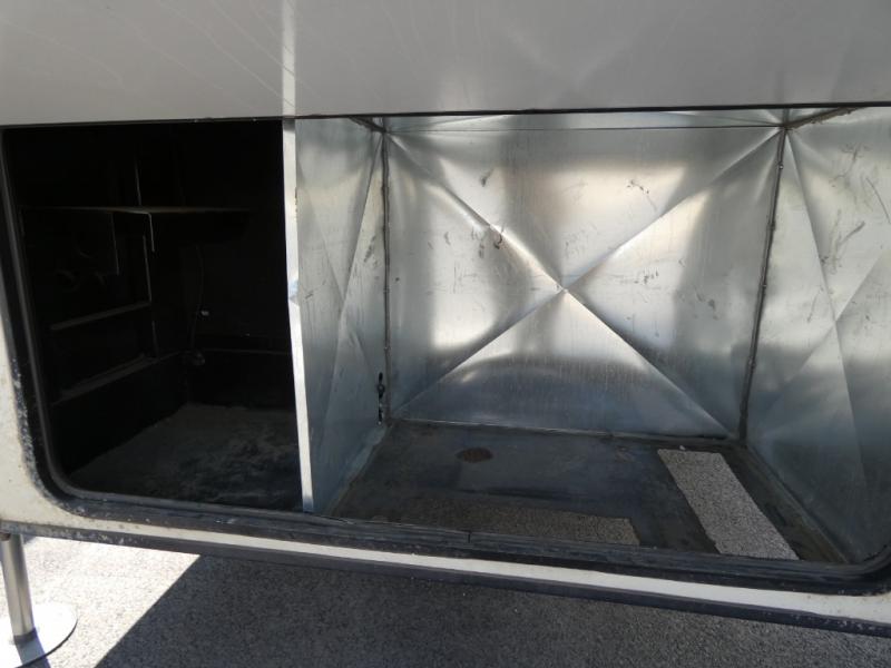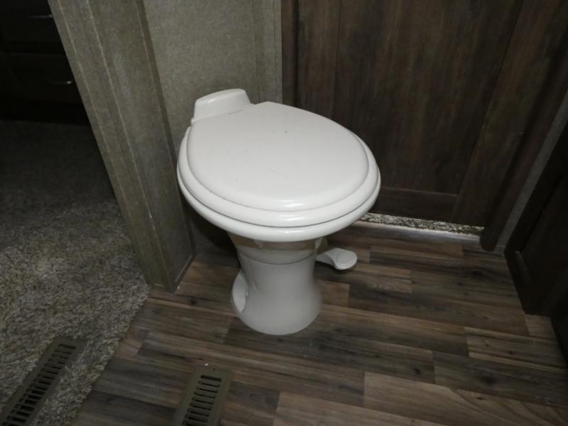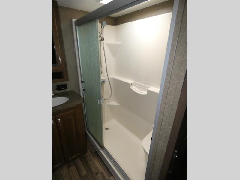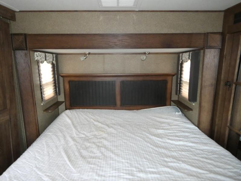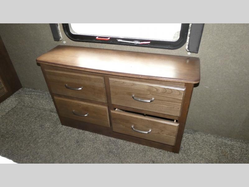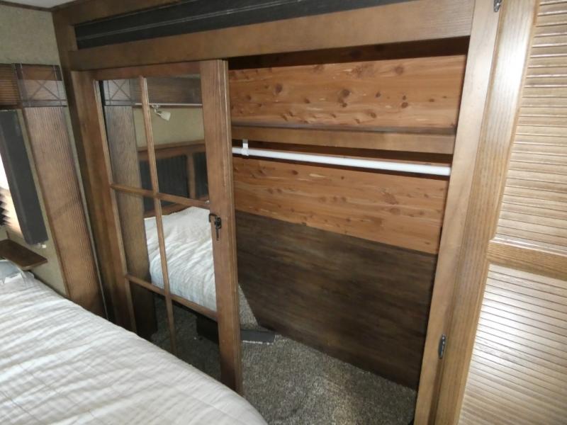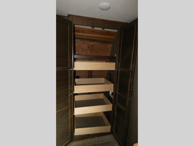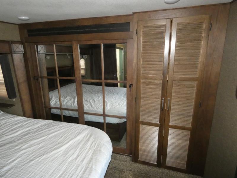 The private bedroom can be accessed from the hall or from inside the bathroom. Notice a chest of drawers with a space for a TV above along the curb side wall. There is a king bed slide out opposite which gives you added foot traffic space. The front wall offers more storage for your clothing with a large closet including sliding doors. There is also a second closet in the corner that has been prepped for a washer and dryer if you choose to add, that also features some drawer space, plus so much more!