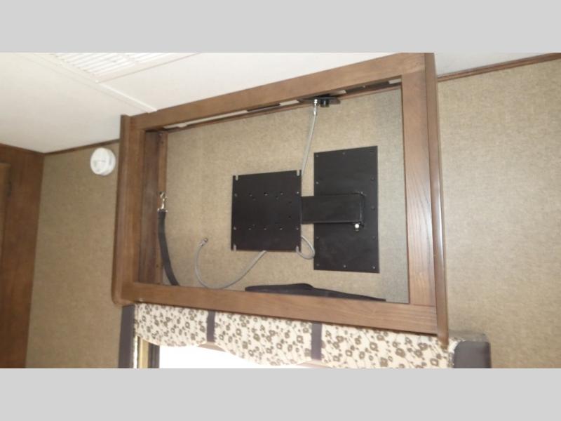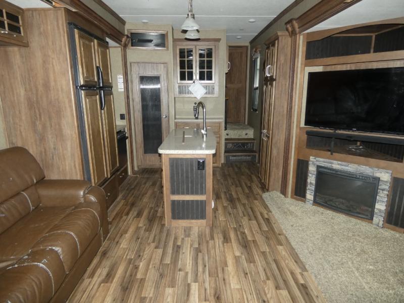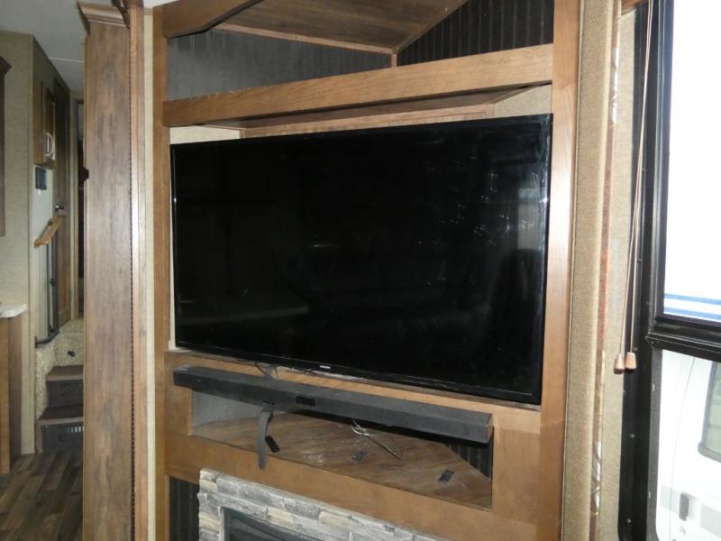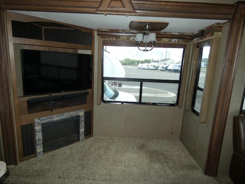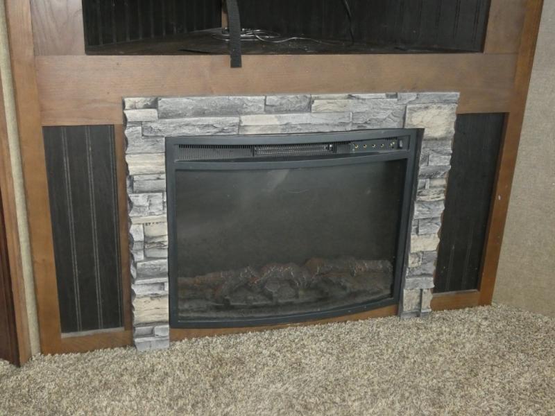Just inside the door to your left there is a small pantry for more storage needs. Next, a slide out which features a corner entertainment center with fireplace.