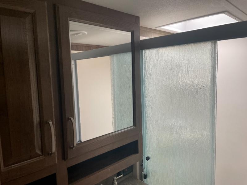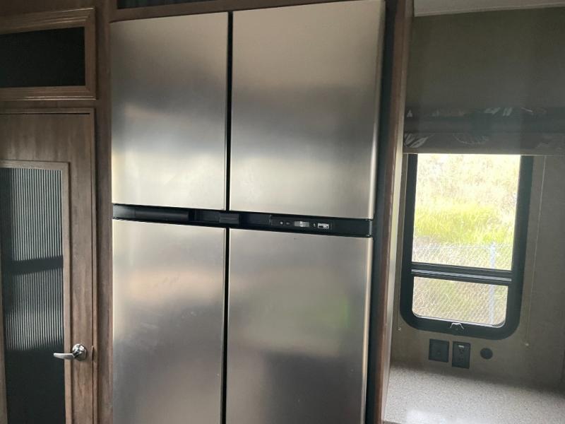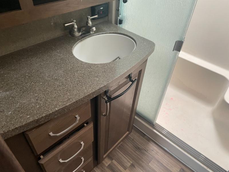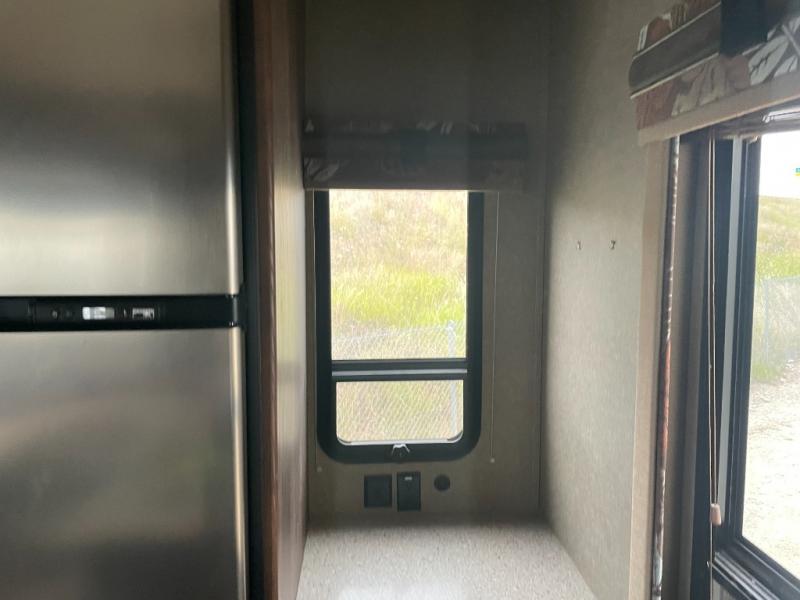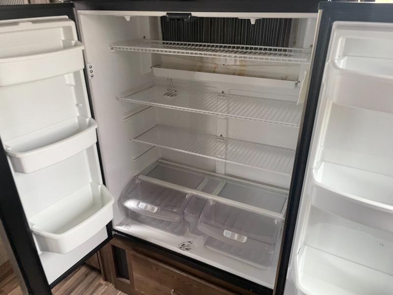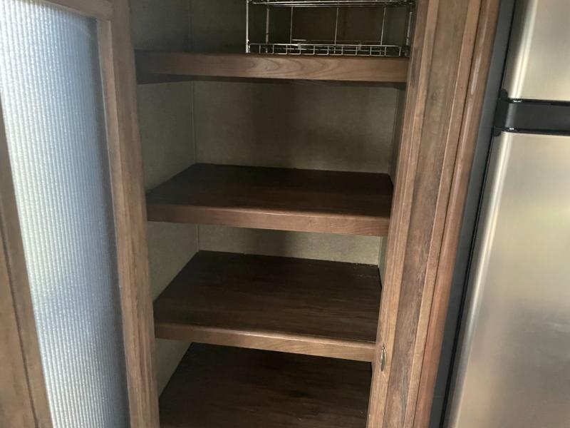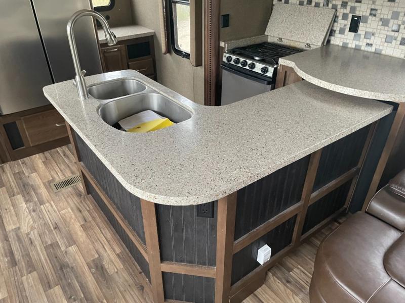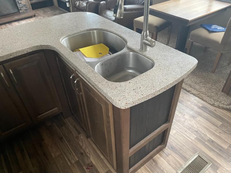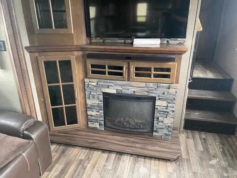 Not only will you be able to entertain guests easily, but cooking in the rear kitchen provided will be a breeze as well. Along the rear wall is a storage pantry for your non-perishables, counter space, and a refrigerator. In the slide out along the road side wall you will find a three burner range, overhead microwave, and an L-shaped countertop with a double sink for easy cleanup. Continuing in the slide out is an L-shaped tri-fold sleeper sofa with storage above. The interior wall serves as an entertainment center with a fireplace below, plus storage cabinets both above and below.