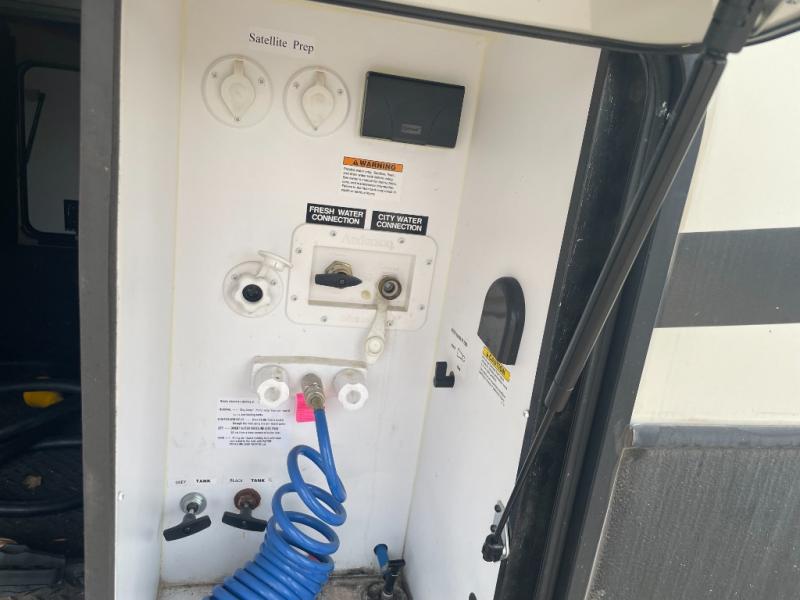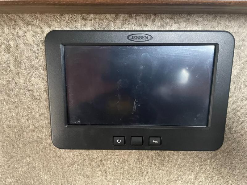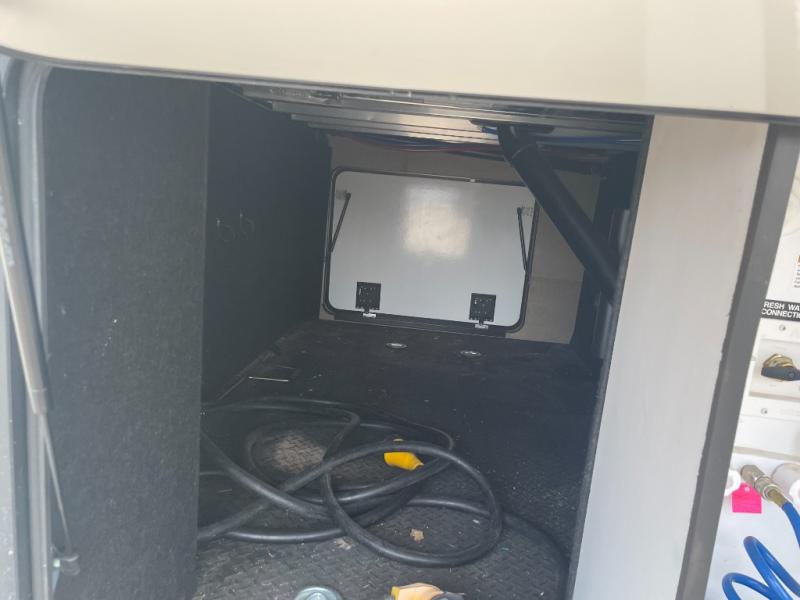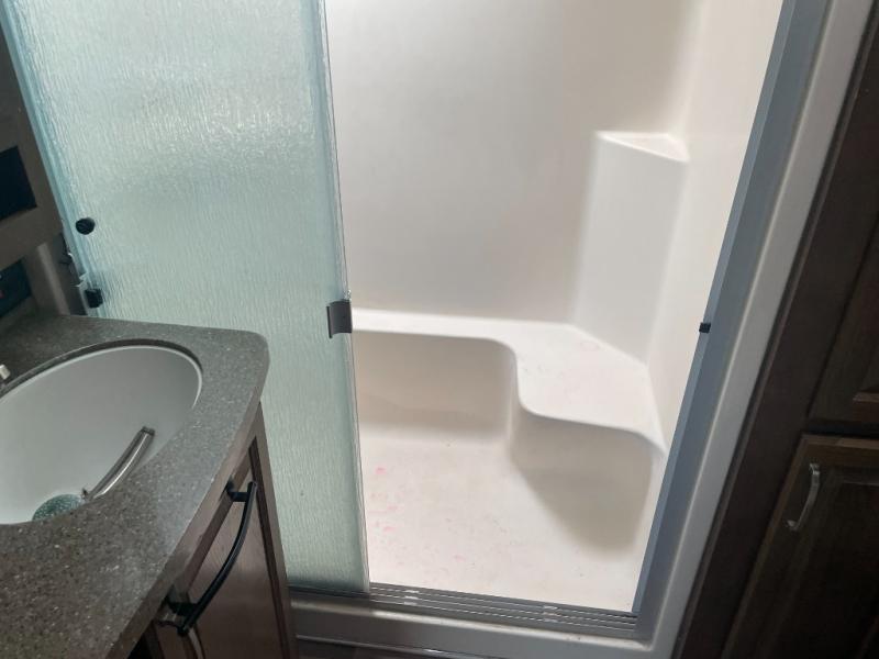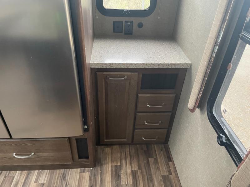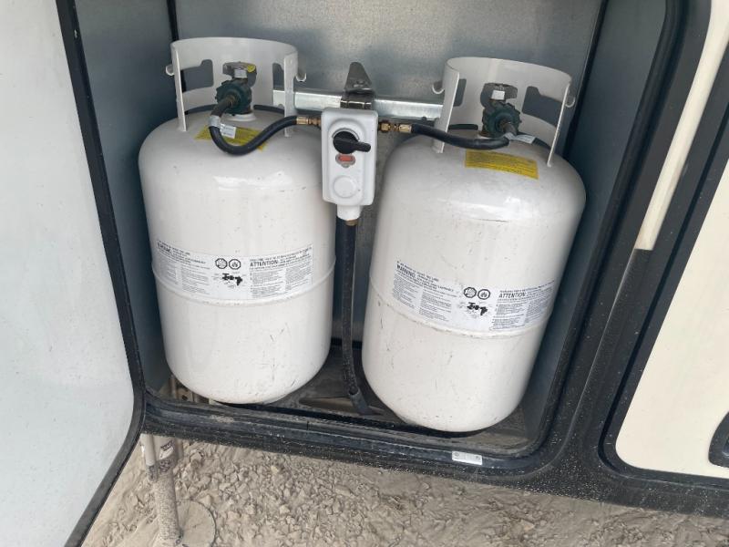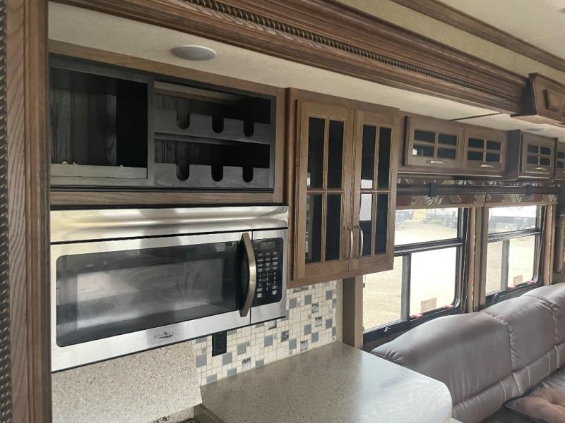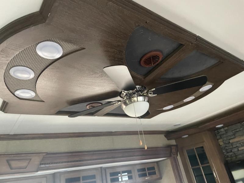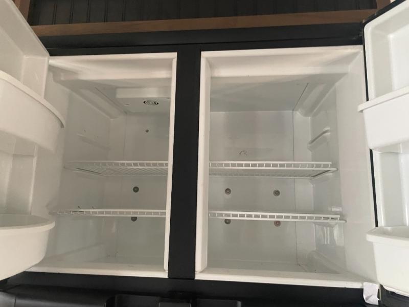 Not only will you be able to entertain guests easily, but cooking in the rear kitchen provided will be a breeze as well. Along the rear wall is a storage pantry for your non-perishables, counter space, and a refrigerator. In the slide out along the road side wall you will find a three burner range, overhead microwave, and an L-shaped countertop with a double sink for easy cleanup. Continuing in the slide out is an L-shaped tri-fold sleeper sofa with storage above. The interior wall serves as an entertainment center with a fireplace below, plus storage cabinets both above and below.