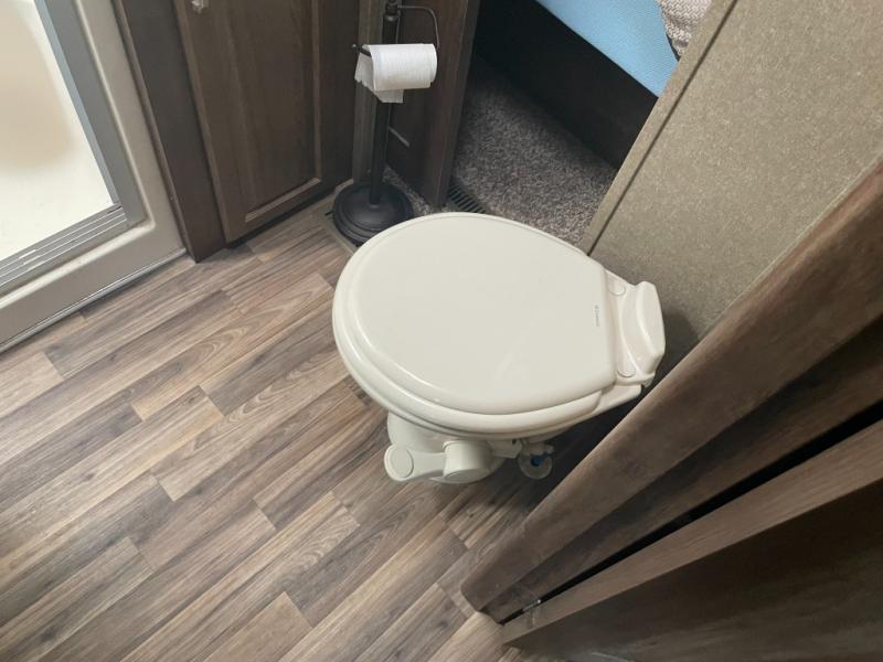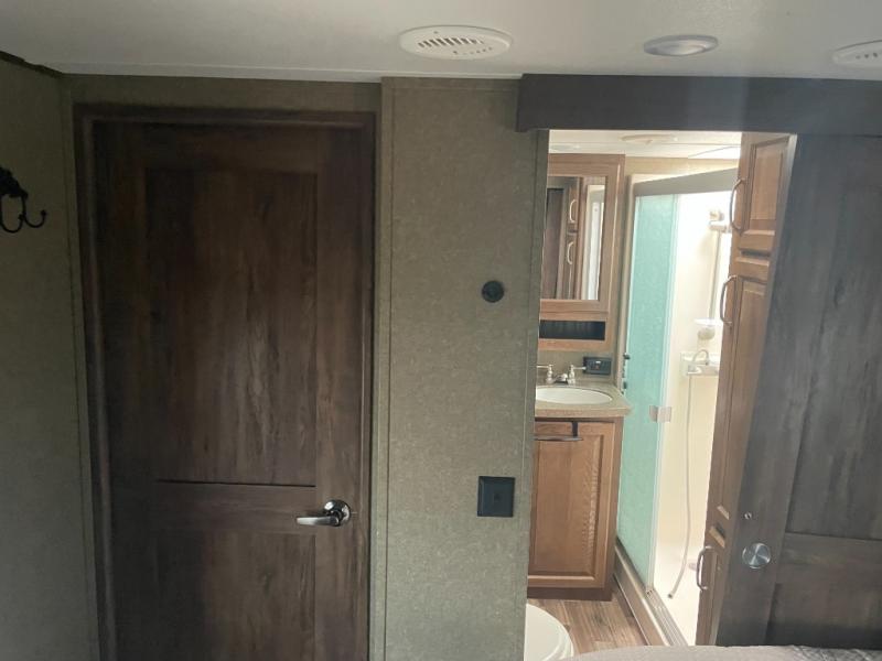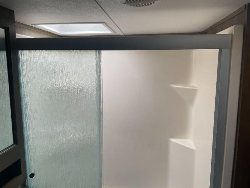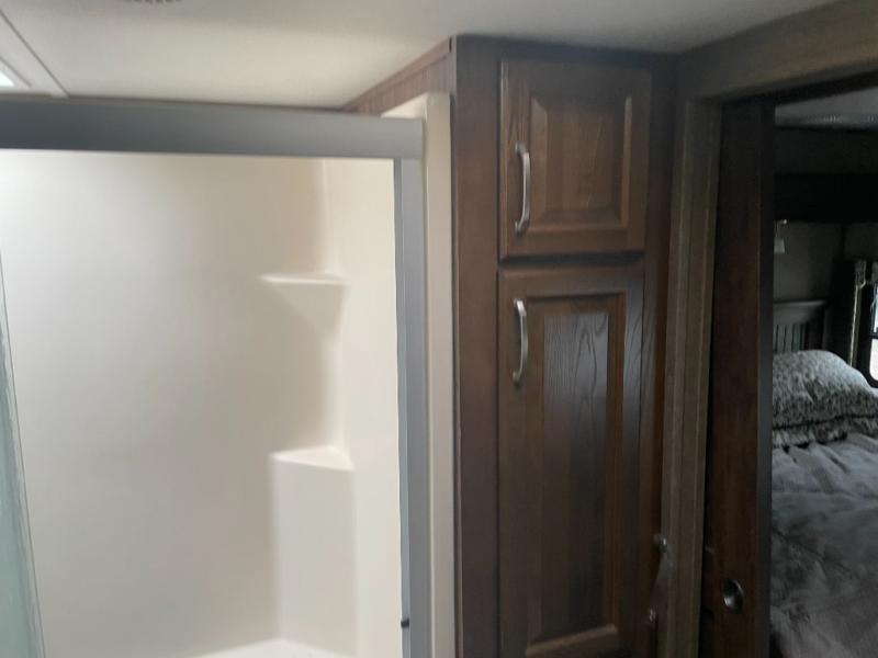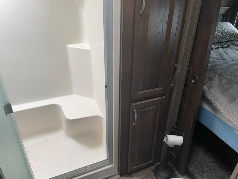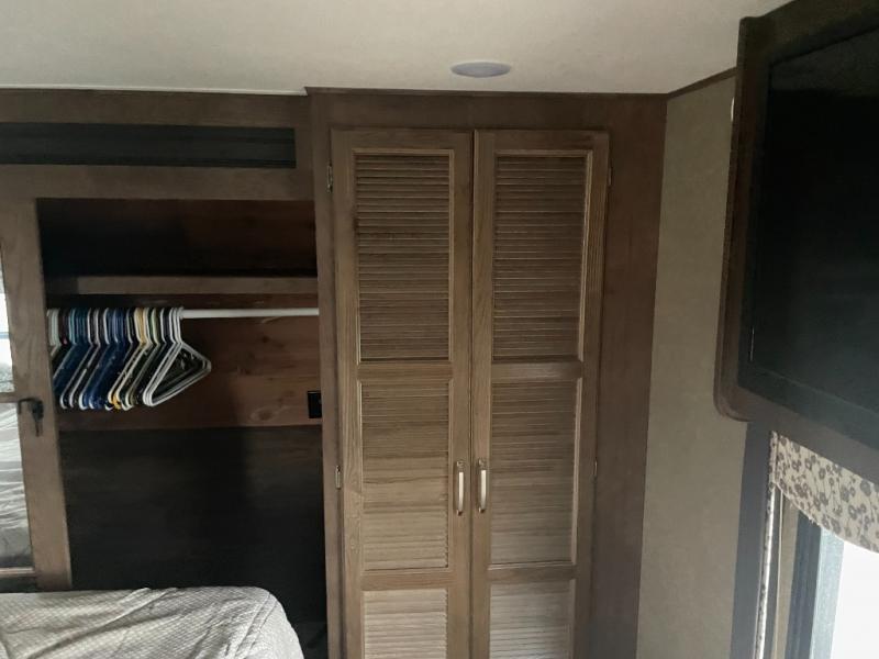 You will have no trouble relaxing and getting a good nights rest in the private front bedroom with hall entry as well as through the bathroom. You can drift off to sleep enjoying a spacious king size bed that slides out for added foot traffic space at the foot of the bed. Along the opposite wall find a TV/chest with overhead storage. There is also a walk-in closet for all of your hanging clothes featuring sliding doors. In the corner a space has been prepped for a stackable washer and dryer so you can return home ready to put away all of your clean clothes, plus so much more.