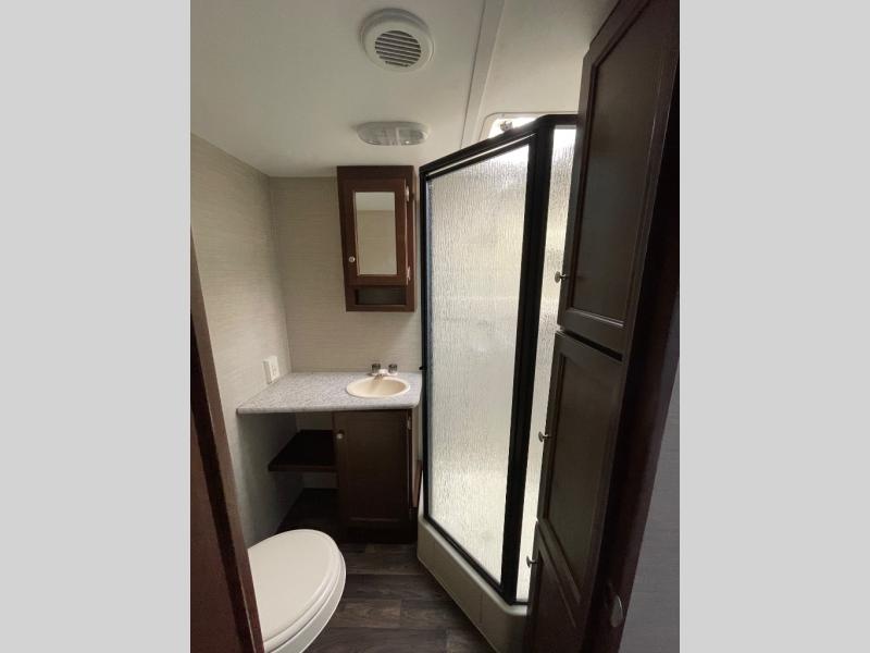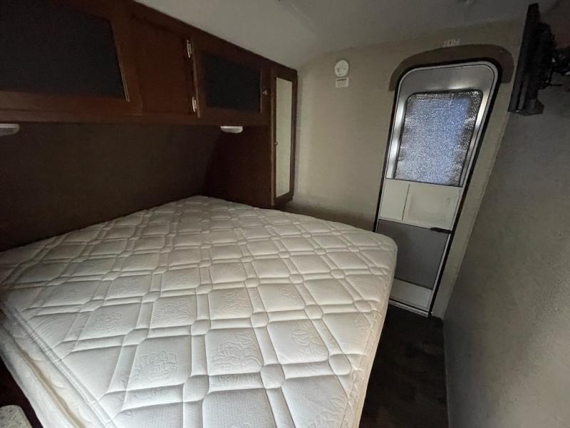 All the way to the front of the Bullet 248RKS is a comfy queen bed with wardrobes on either side of the bed, along with a laundry chute and an overhead cabinet for more storage. There is also a private bedroom entry/exit door for your convenience.