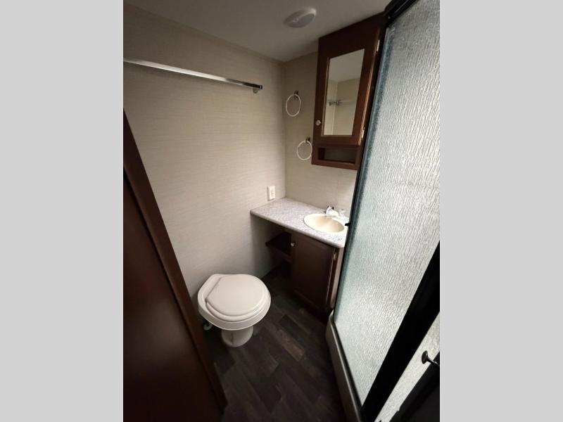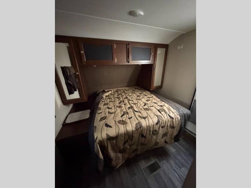 All the way to the front of the Bullet 248RKS is a comfy queen bed with wardrobes on either side of the bed, along with a laundry chute and an overhead cabinet for more storage. There is also a private bedroom entry/exit door for your convenience.