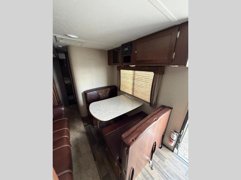 Dine comfortably on the booth dinette just to the right of the entry door. There is also an overhead cabinet for storage plus an LCD TV above for viewing from the sofa across the room.