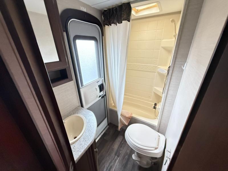 In the rear of 272BHS there is a double bed set of bunks with angled corner and ladder for accessing the top bunk, plus a privacy curtain. The opposite rear corner features a full bath with private entry from outside, and includes a tub/shower, toilet and sink.