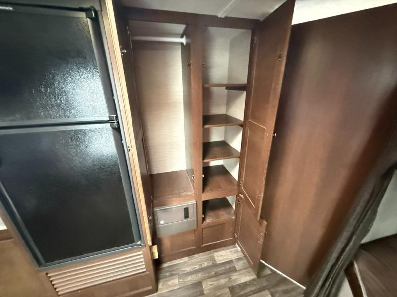 On the curb side you will find a kitchen that has everything you need to create gourmet meals and snacks on the go. There is a refrigerator, three burner range, overhead storage, and large kitchen sink on a L-shaped counter. There is also plenty of overhead storage space for dry goods, dishes, and so much more. You will find even more storage next to the refrigerator with a double door pantry/wardrobe.