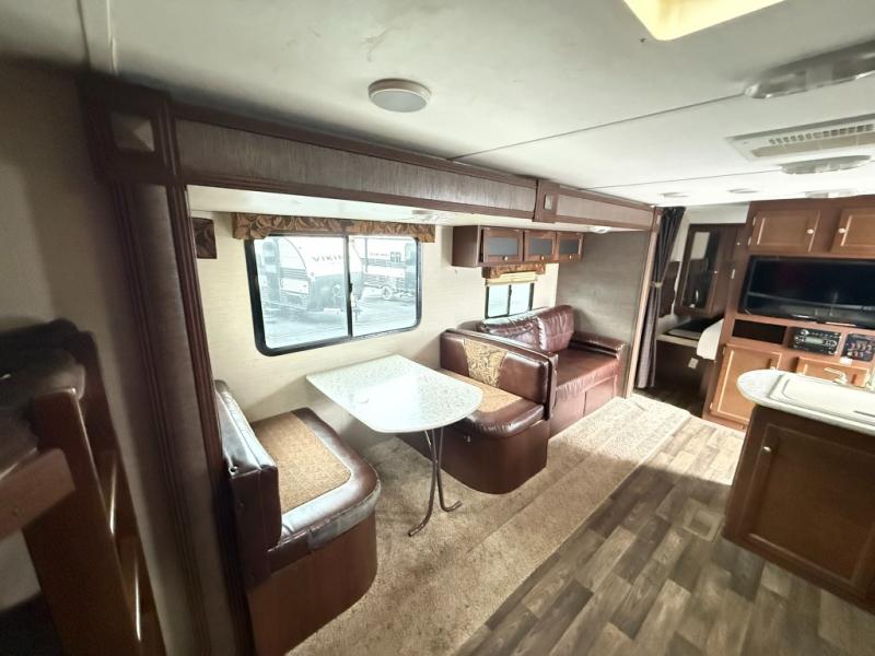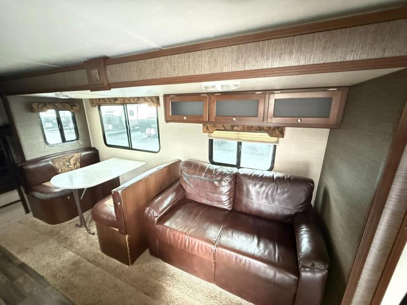 Step inside the main entry door closest to the front of the trailer and be greeted by a spacious interior with large slide out sofa and booth dinette. When it's time for relaxing, the entertainment center is along the interior center wall facing the kitchen/living area.