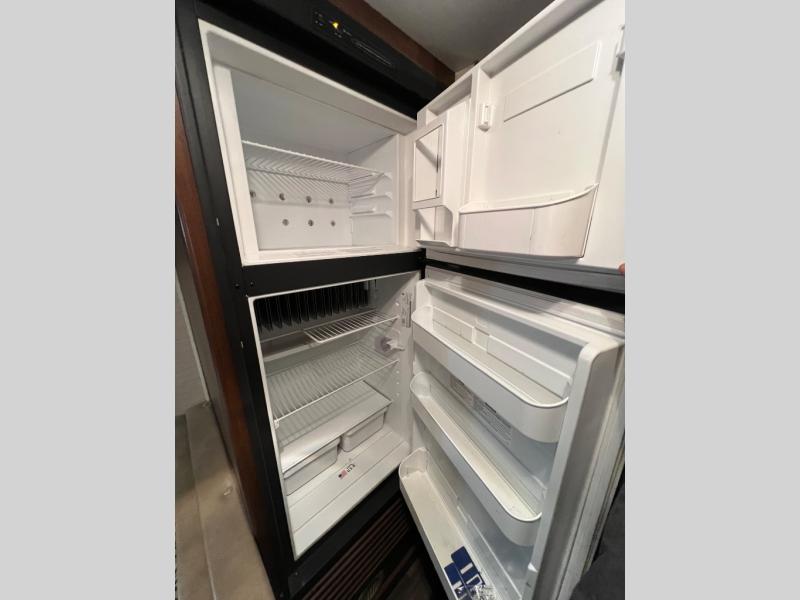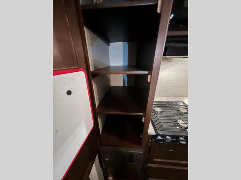 Next you will find a kitchen sink, three burner range, overhead storage, and a pantry along the road side. On the opposite side is a dinette, refrigerator, and additional overhead storage.
