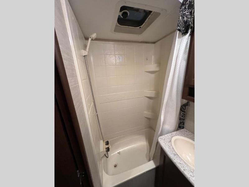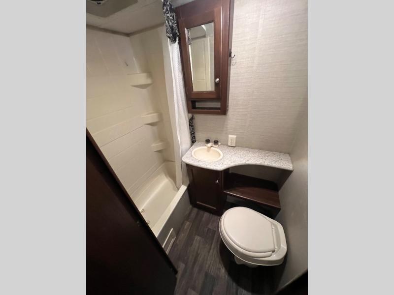 In the left rear of the trailer you will find a full bath including a tub/shower, vanity sink, and a toilet.