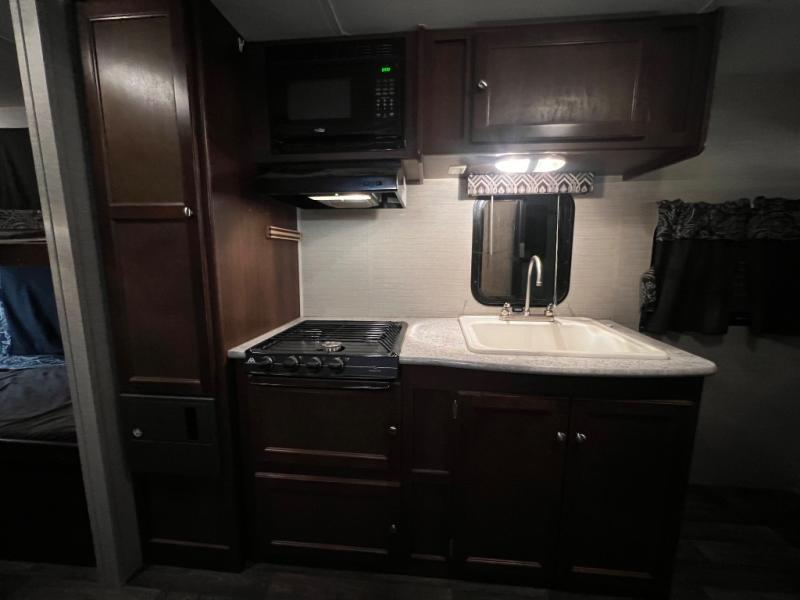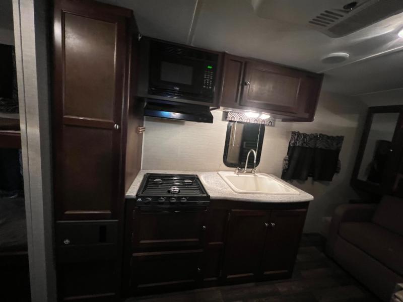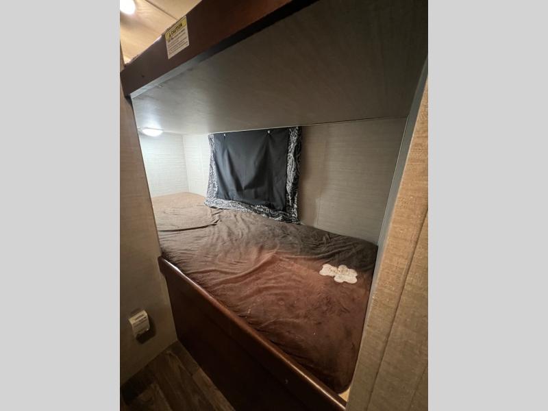 The Bullet Crossfire 2070BH bunkhouse by Keystone RV features a set of bunk beds in the rear of the travel trailer, a rear bath, a Murphy bed, plus more!