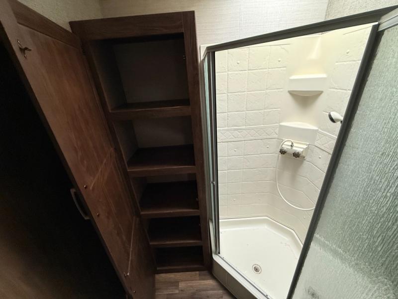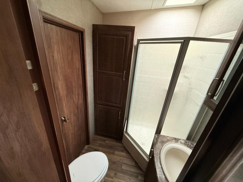 Move to the rear of this fifth wheel and find a full bath with a toilet, sink, neo-angle shower, and linen cabinet.