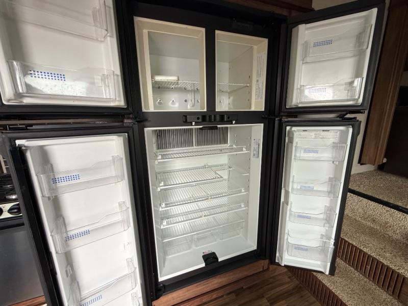 Step inside and find yourself in a spacious retreat with a large center kitchen. There is a free standing dinette to your right as you enter. Straight ahead is a L-shaped counter with a double sink, overhead cabinets, and counter space. The slide out on the curb side features a large pantry, three burner range, and a 12 cu. ft. refrigerator.