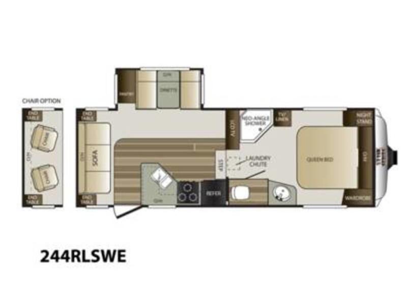 As you step inside model 244RLSWE you will find a rear sofa with overhead storage, plus end tables on either side. You can also choose the optional rocker recliners instead of the sofa still retaining the storage above, as well as the end tables.