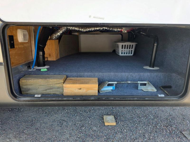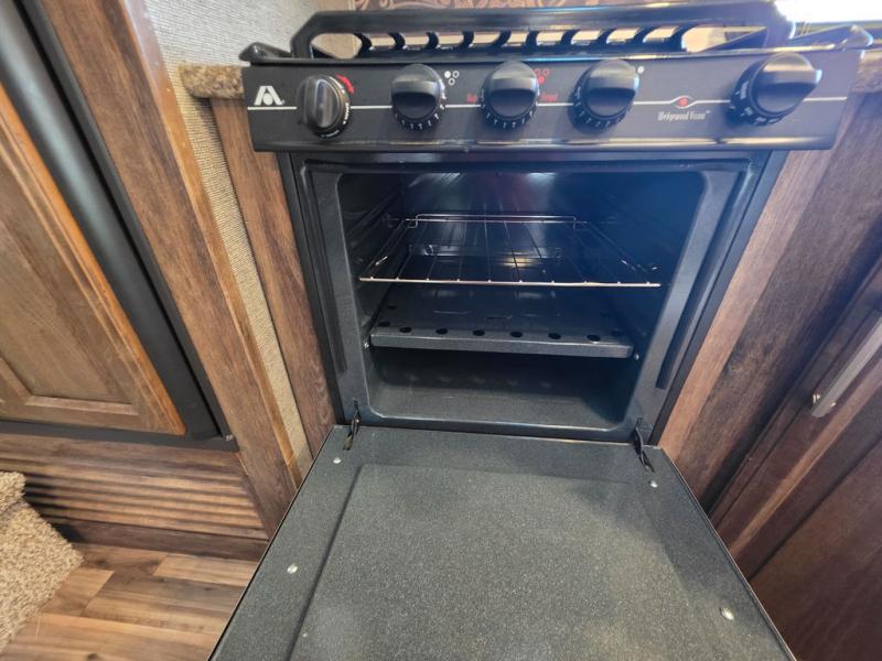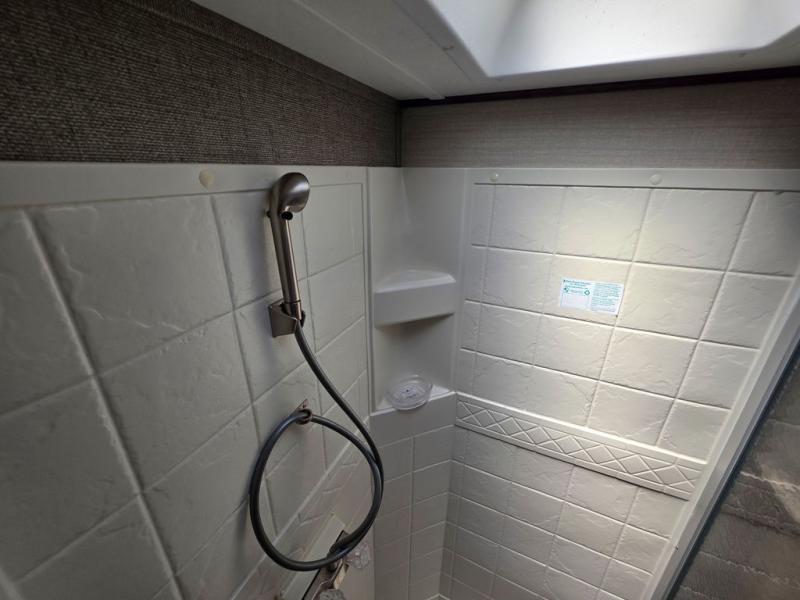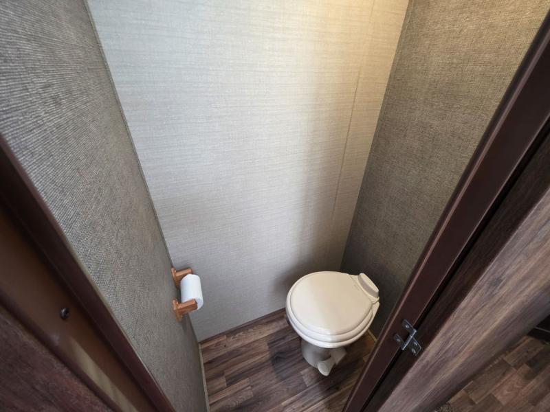 In front take a step up to the master suite featuring a convenient laundry chute at the top. There is a private toilet area on the right with a vanity and sink just around the corner. A neo-angle shower can be found on the left next to a linen cabinet with space for a TV on top. There is a queen bed with overhead storage in the center of the front wall with a wardrobe on one side and nightstand opposite. Enjoy overhead storage above the bed for all of your storage needs, and so much more!