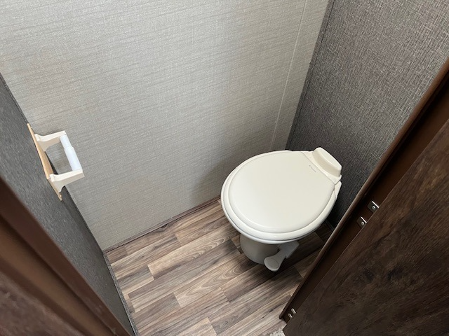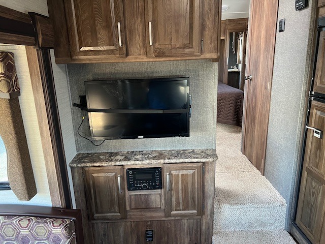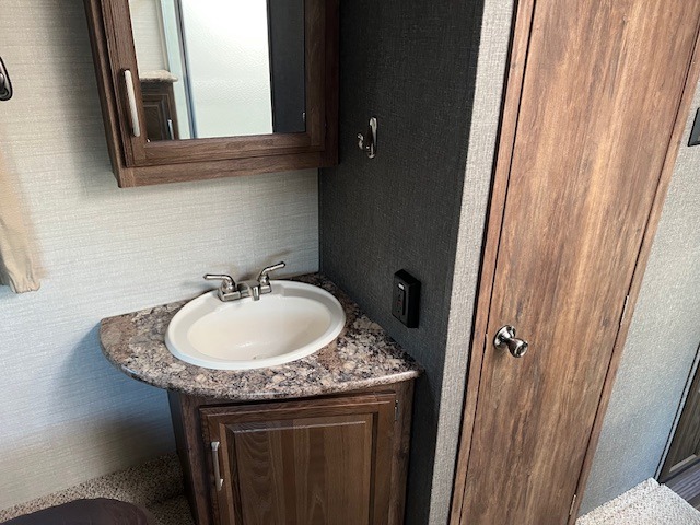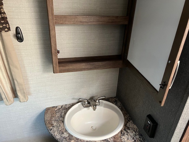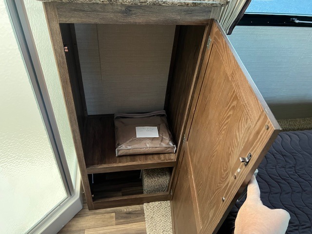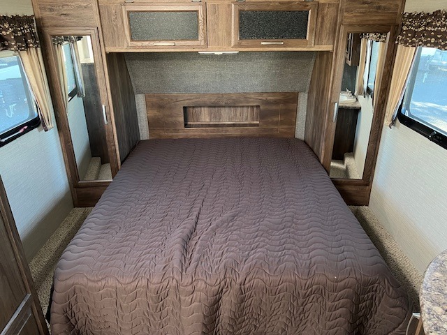 In front take a step up to the master suite featuring a convenient laundry chute at the top. There is a private toilet area on the right with a vanity and sink just around the corner. A neo-angle shower can be found on the left next to a linen cabinet with space for a TV on top. There is a queen bed with overhead storage in the center of the front wall with a wardrobe on one side and nightstand opposite. Enjoy overhead storage above the bed for all of your storage needs, and so much more!