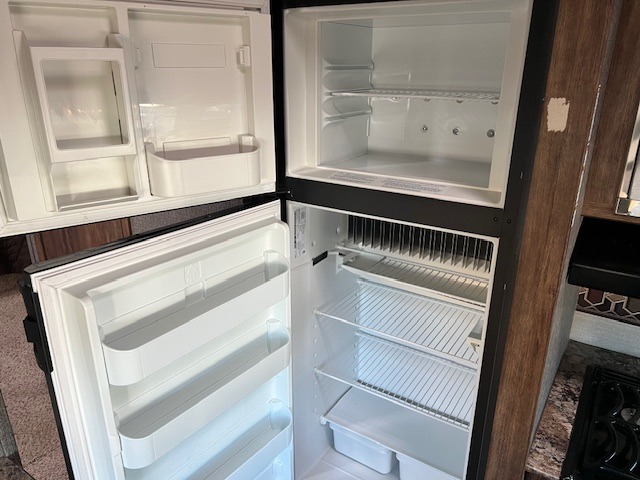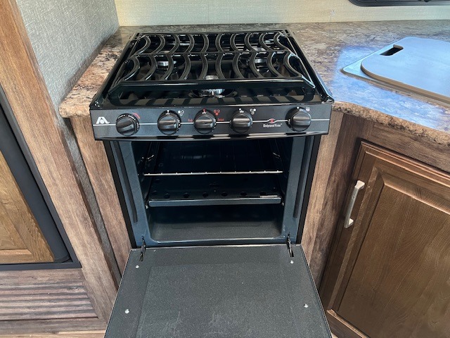 Before heading up front check out the kitchen which features plenty cabinet space for storage, and counter space near the angled double sink. There is a refrigerator and three burner range that will allow you to easily prepare and cook all of your meals.