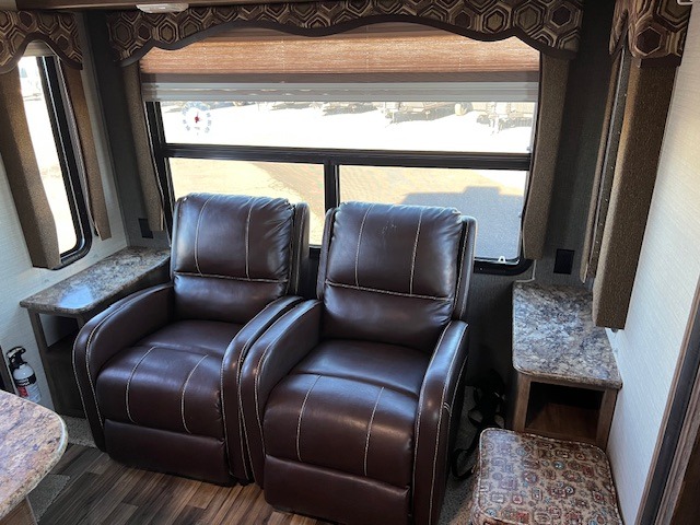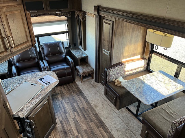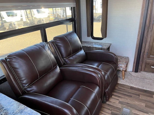 As you step inside model 244RLSWE you will find a rear sofa with overhead storage, plus end tables on either side. You can also choose the optional rocker recliners instead of the sofa still retaining the storage above, as well as the end tables.