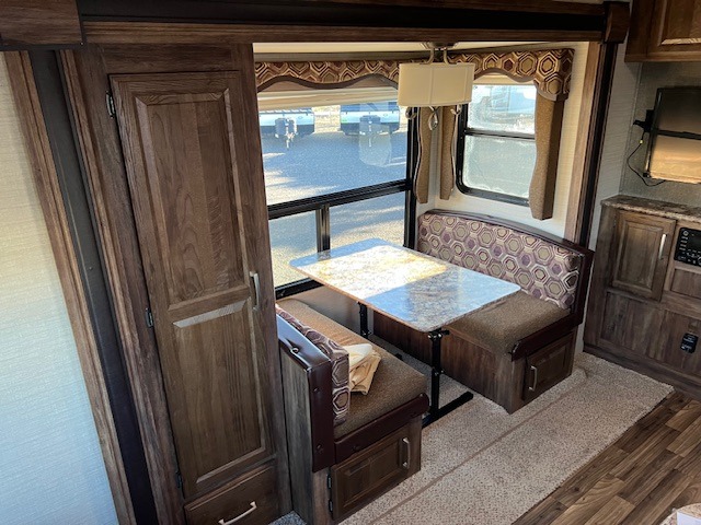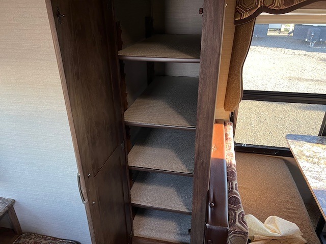The slide out straight in from the door features a booth dinette for dining and also a pantry for canned and dry good storage, plus more. There is an area for an optional 32" TV near the front step up that lead to the master bedroom and bath.