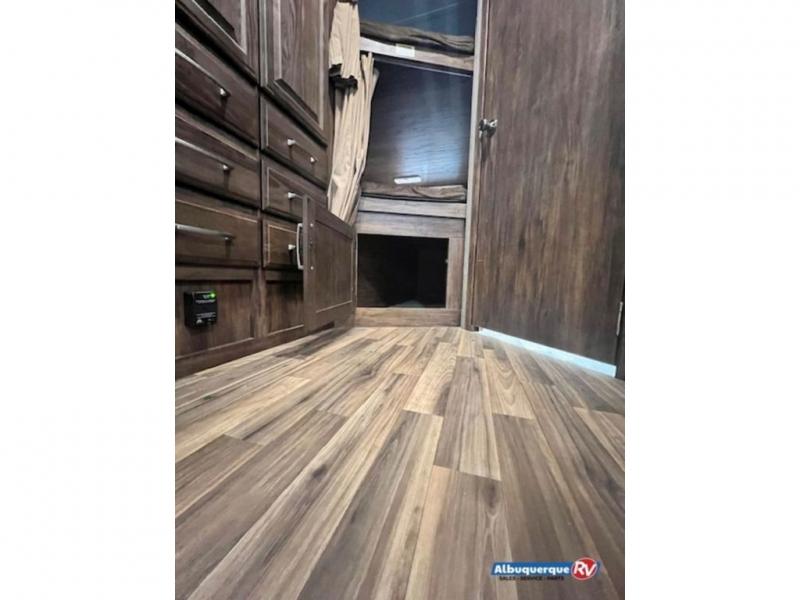 Step inside the entry door and check out the front master bedroom behind the sliding door. Inside find a queen size bed with overhead storage, dual wardrobes, and a laundry chute to keep things neat and organized.