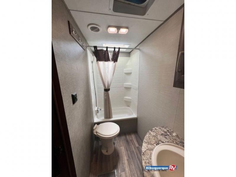 The rear bath provides the basic amenities of a tub/shower, toilet, and a sink.
