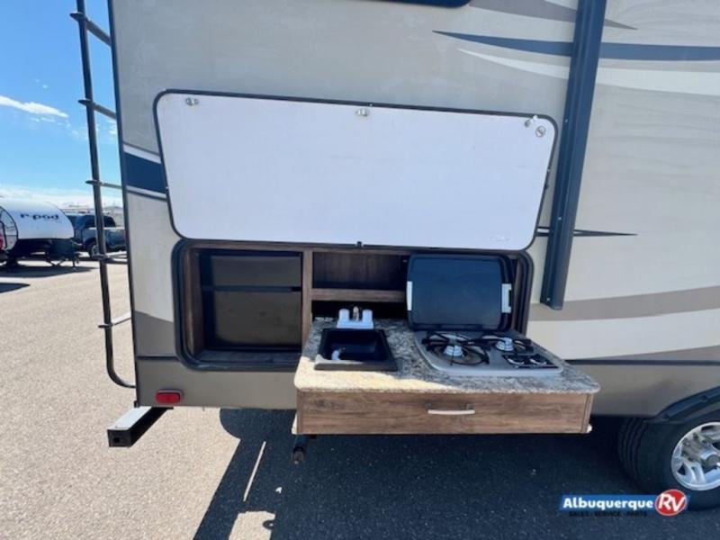 The rear pull out camp kitchen features a refrigerator, pull out stove top and single sink, plus exterior counter top, and storage. Outside find additional storage for all of your larger camping gear and more in the pass-through storage compartment, plus much much more inside and out!