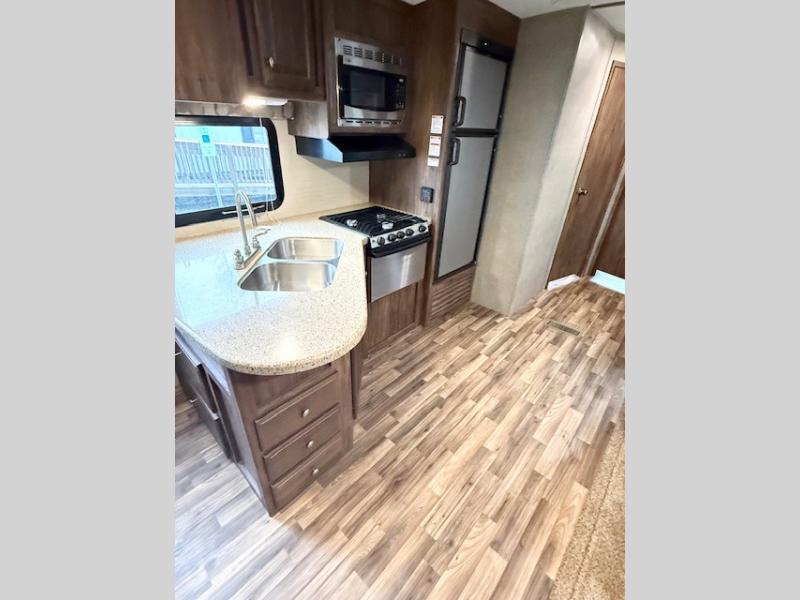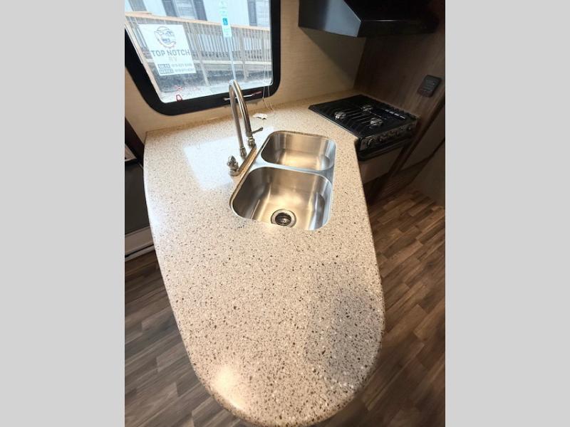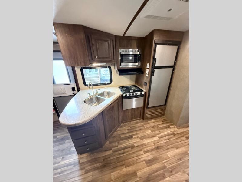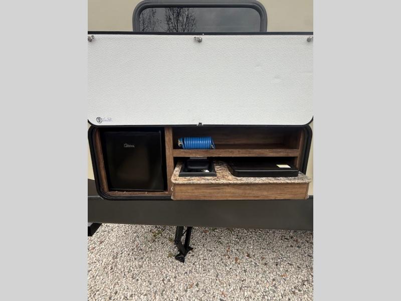 Outside find additional storage for all of your larger camping gear and more in the front pass-through storage compartment. The rear pull out camp kitchen features a refrigerator, pull out stove top and single sink, plus exterior counter top, storage, and so much more!