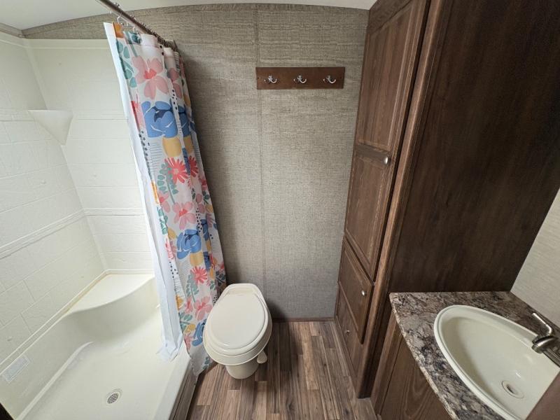 - Rear Full Bath – Includes a shower, toilet, linen cabinet, and vanity with sink