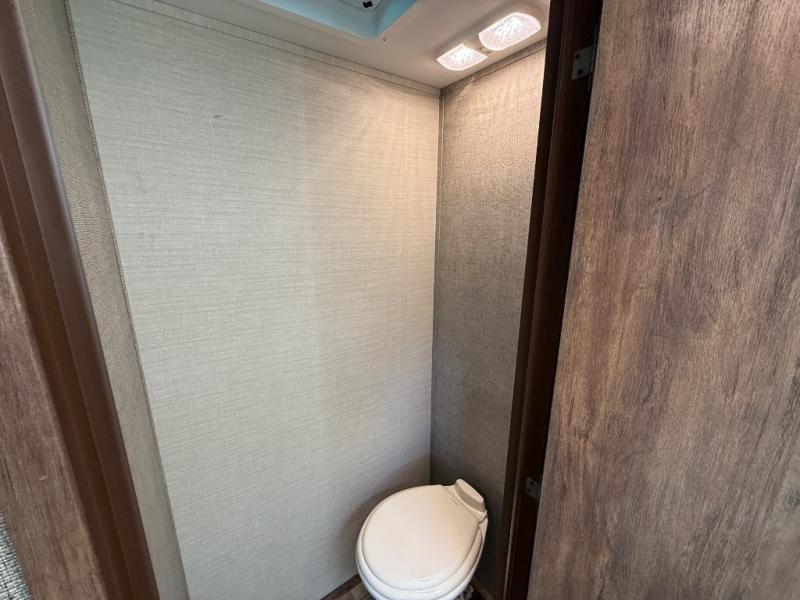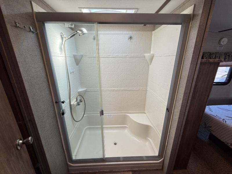 One step up to the front bed and bath area behind a sliding door. The shower is located on your left and private toilet area is on the right. Just beyond the toilet area find a separate sink inside the bedroom space.