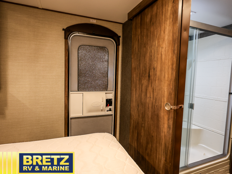 Sliding doors lead into the front master bedroom with a convenient private exterior entry door. Enjoy a comfy King bed, dual bedside wardrobes, and overhead cabinets.