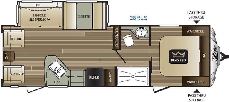 As you step inside you are greeted with an inviting living area including two recliners with an end table and overhead storage space. There is a tri-fold sleeper sofa and booth dinette slide out for plenty of seating during mealtimes and just hanging out. Plus, both can be quickly converted to sleeping space for family or guests. A nearby entertainment center can be easily viewed from anywhere in the room.