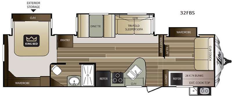 The first door on the right leads into a front private bunkhouse which is where the kids will most likely be hanging out. There is a set of bunks that are 28" x 74" on the right as you step inside. Along the front wall is a cub couch, and a slide out wardrobe is opposite the bunks. There is also a 32" TV along the interior wall of the bunk room.